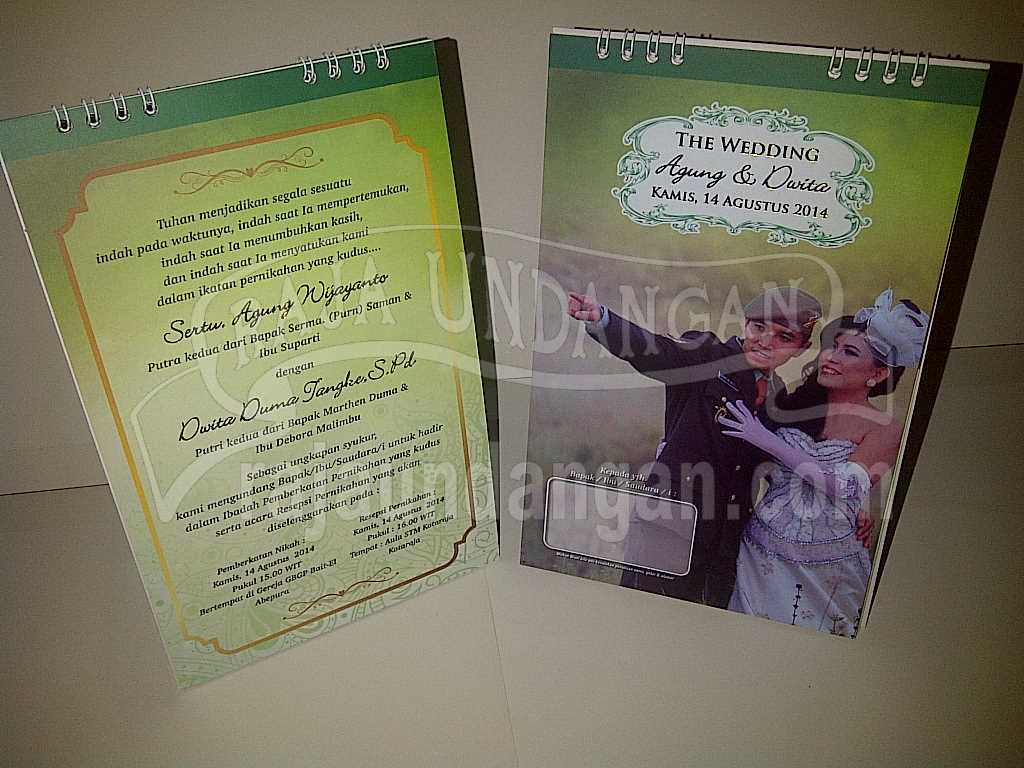 Bosan dengan undangan pernikahan hardcover atau softcover model biasa/umum? Mungkin Anda bisa mencoba dengan desain undangan pernikahan yang berfungsi tak sekedar hanya undangan saja. Salah satu contohnya ada pada undangan pernikahan Agung dan Dwita yang berupa kalender meja atau kalender duduk. Dan sebenarnya sudah pernah kami posting undangan serupa di SINI namun, desain kali ini sedikit lebih diperbaharui.