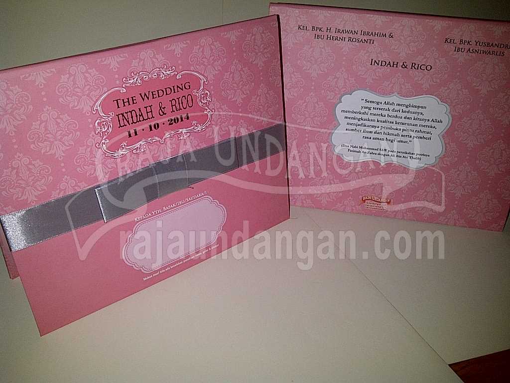 Salah satu buktinya adalah klien kami Indah dan Rico yang berasal dari Kepulauan Riau. Jarak antara kami dengan mereka memang jauh tetapi sangat dekat ketika mereka memesan undangan pernikahan secara online. Desain yang diinginkan serta jenis kertas yang akan digunakan untuk undangan mereka pun hanya dibicarakan secara online. Hasilnya bisa dilihat sesuai dengan gambar dan spesifikasi berikut ini: