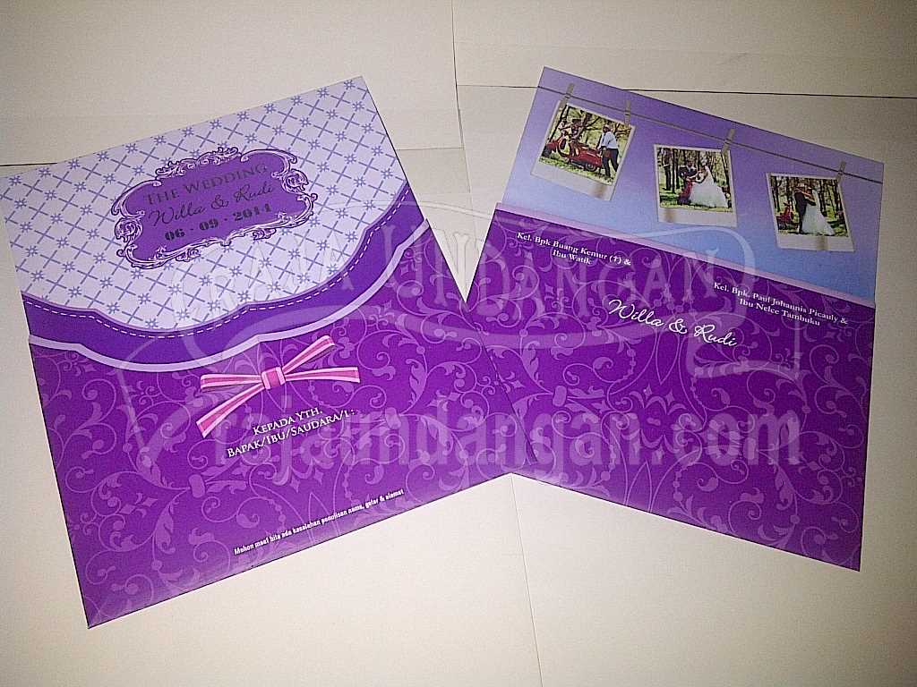 Undangan pernikahan ini terkesan seperti undangan yang memiliki amplop, namun didesain sedemikian rupa sehingga tetap dalam 1 lembar undangan (hanya saja lipat 3). Spesifikasi undangan di atas adalah sebagai berikut: